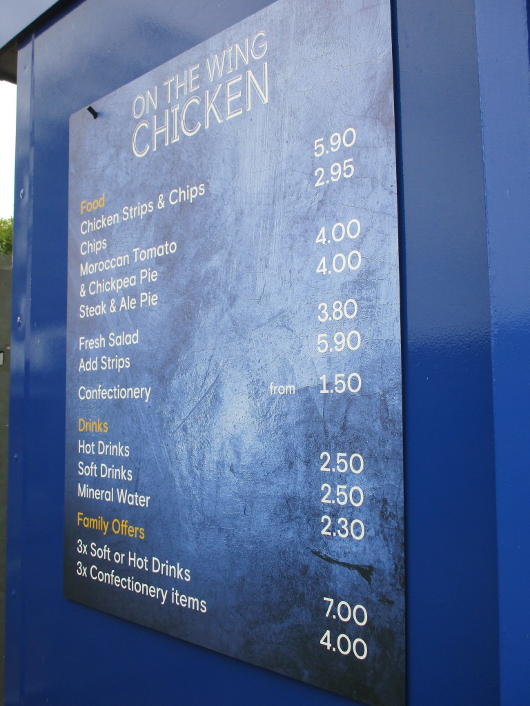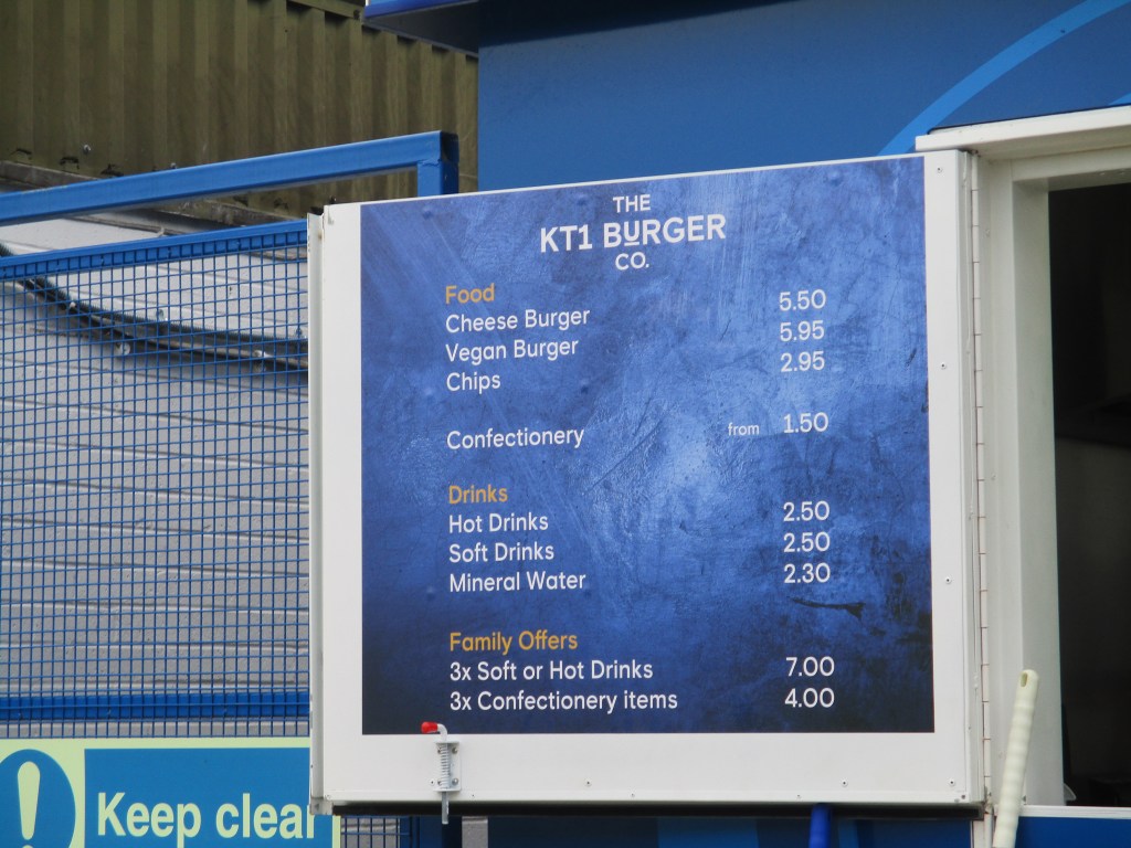 There are two food kiosks available for the west and south stands. One is at the end of the south stand in the corner with the east side (not open for the Wolfsburg match) and the other is near the entrance/toilets between the south and west stands. The south west area of the ground can get a bit congested with queues for the food kiosk and toilets. See pictures below for what is available to eat/drink and prices. There is an entrance into the bar between the food kiosk and the west stand. Outside of the ground, there are a few takeaways/shops along Kingston Road but if you want pubs/restaurants then Kingston town centre is probably the best place to go.