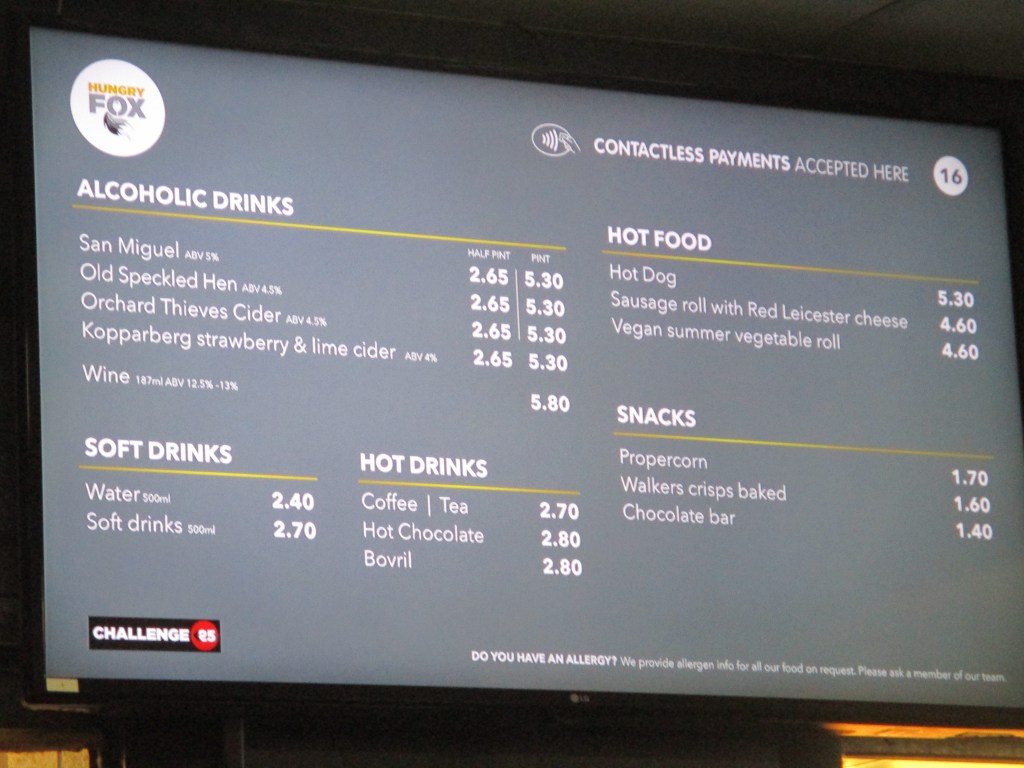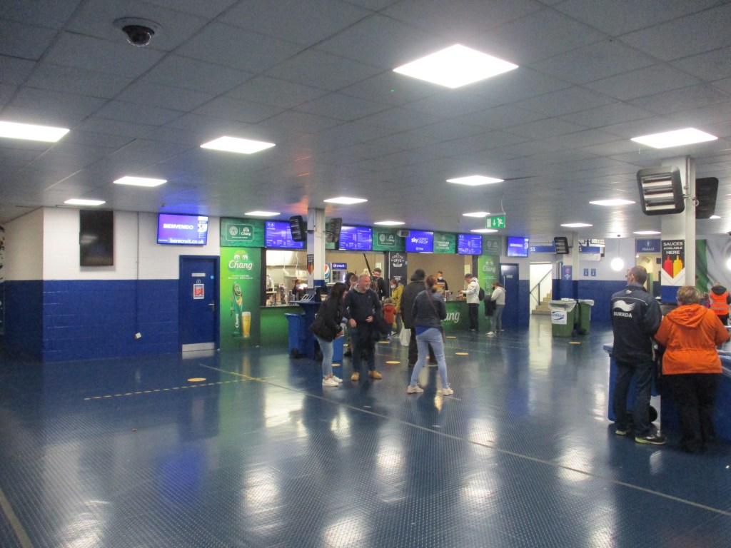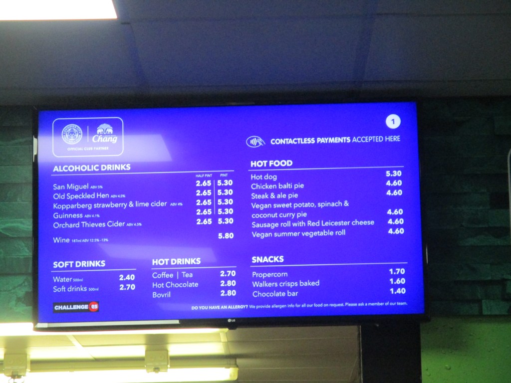 Two food kiosks were open in the concourse area. Not the biggest choice of food but see the pictures below to see the full list of what is available and prices. It is card payment only for food/drink inside the stadium. Alcohol is only allowed to be drank in the concourse area. There are lots of places to eat/drink in the city centre if you fancy something else.