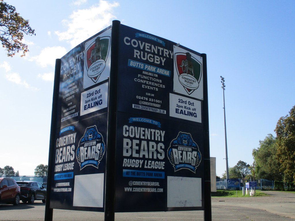 Butts Park Arena is located fairly centrally in Coventry, about a 20/25 minute walk from the city centre. I arrived in Coventry a bit early so went and had a look around the ruins of the old cathedral and the new one next door. The stadium opened in 2004 as the new home of the Coventry rugby union side with the rugby league side, Coventry Bears joining them there shortly afterwards. Both still play at the stadium now. Coventry United (both men’s and women’s sides) started playing there in 2017 (according to Wikipedia). I didn’t notice much saying that the football sides play there outside or inside the ground.