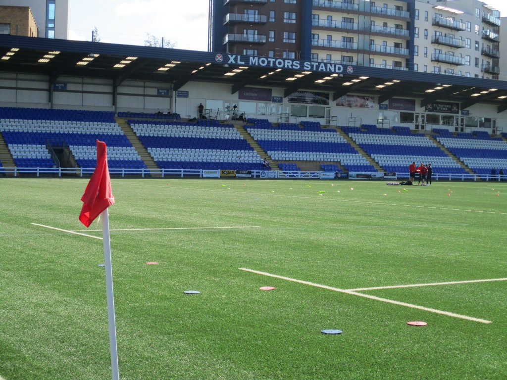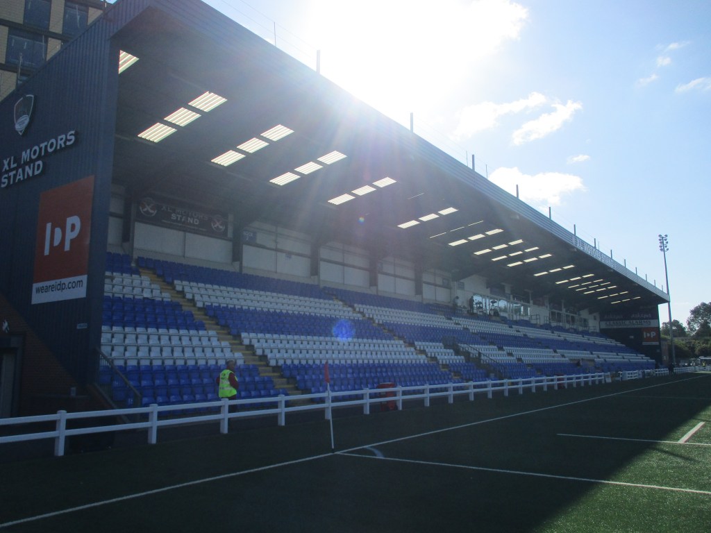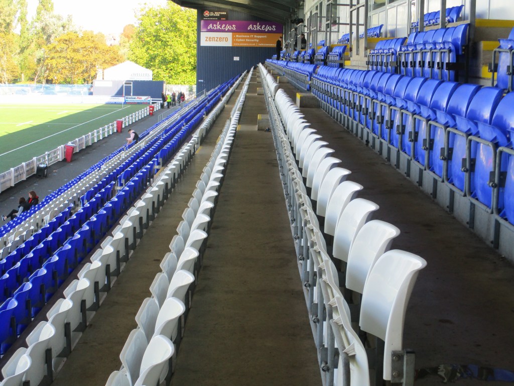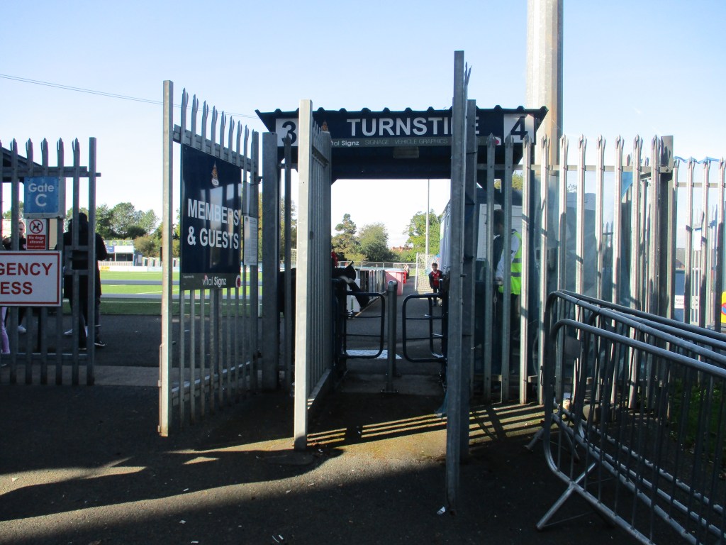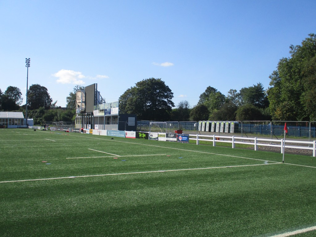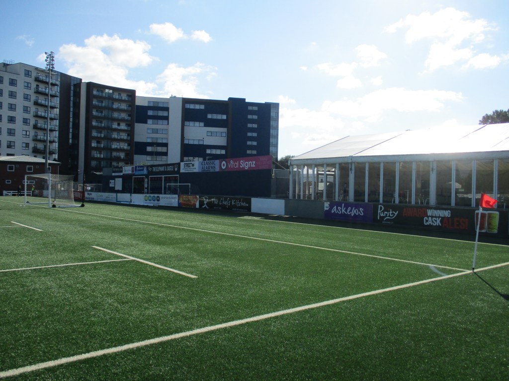 The turnstiles are in one corner of the ground by the car park. There weren’t any bag searches. There is a big covered seated stand along one side of the pitch whilst the rest of the ground is uncovered standing. The far end of the ground from the entrance was not open for supporters as well as part of the side opposite the stand where the managers and subs are. Above this area there is a scoreboard but this wasn’t working for this match. There are toilets at either end of the seated stand, by the turnstiles and in the entrance area to the bar at the far end.