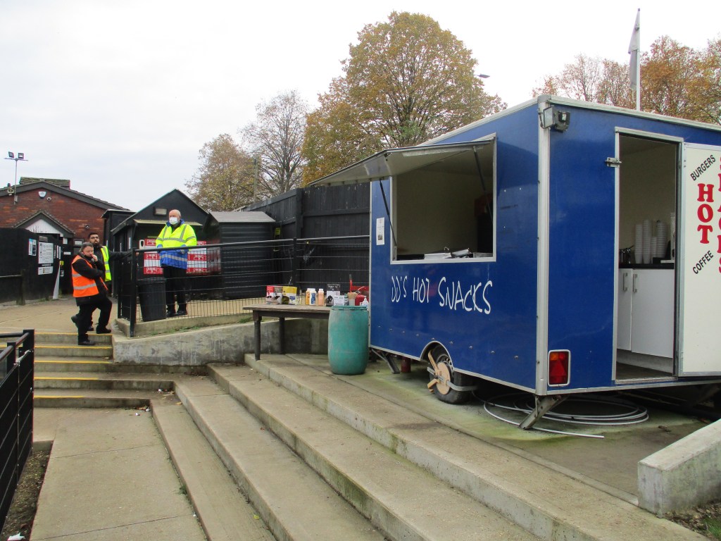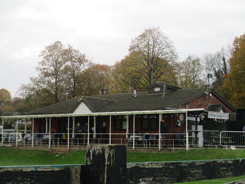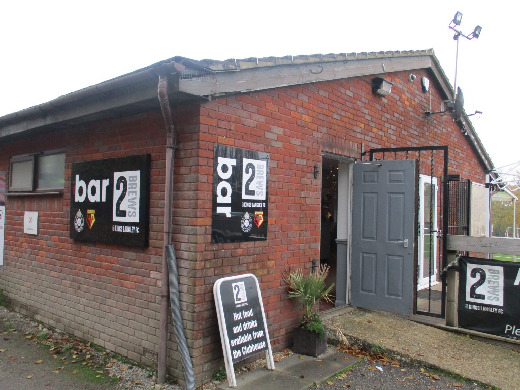 There is a burger van inside the ground near the entrance. Not a big choice of food with burgers/cheeseburgers costing £3.50 and hot dogs £3. Hot drinks cost £1 and cold drinks £1.50. Not the biggest bar either but there is some outdoor seating available. Alcohol is not allowed to be taken into the actual ground. Cash and card are accepted in the bar and at the burger van. There is a pub between the ground and Apsley station and in Kings Langley village, there are a some shops, cafes, takeaways, pubs etc.