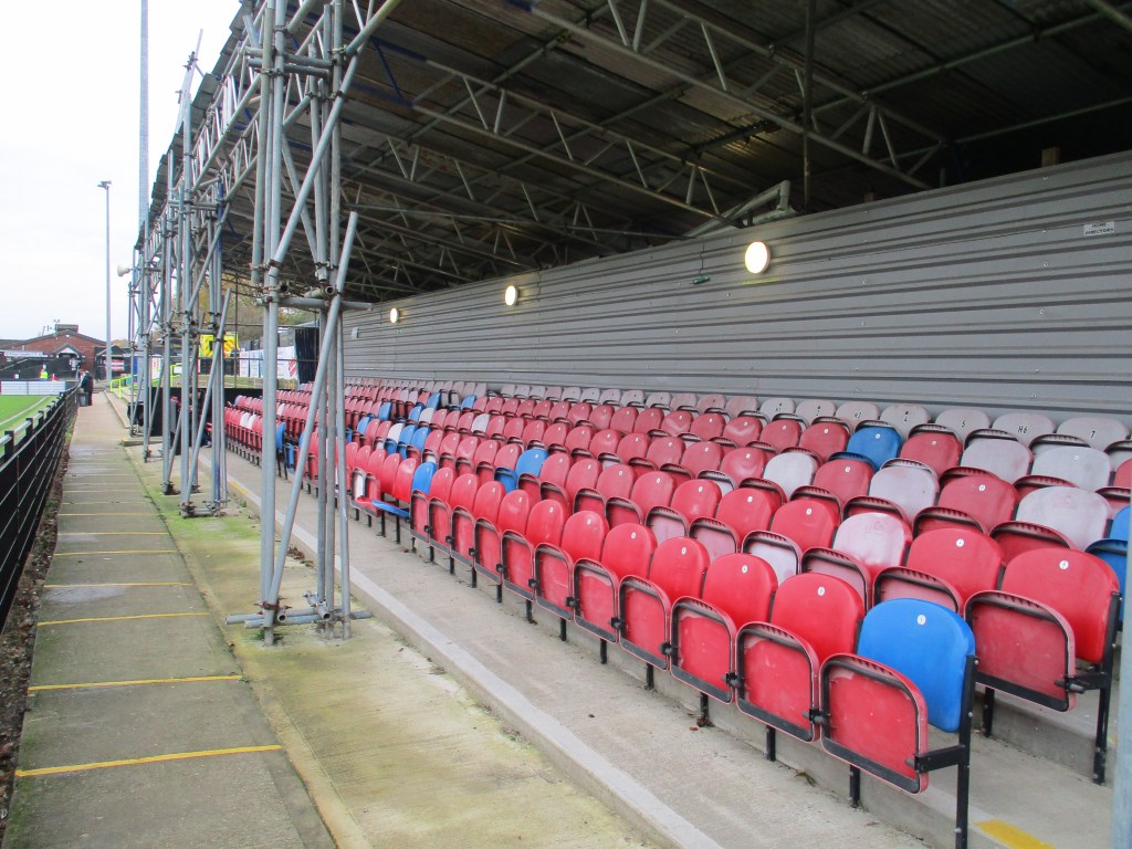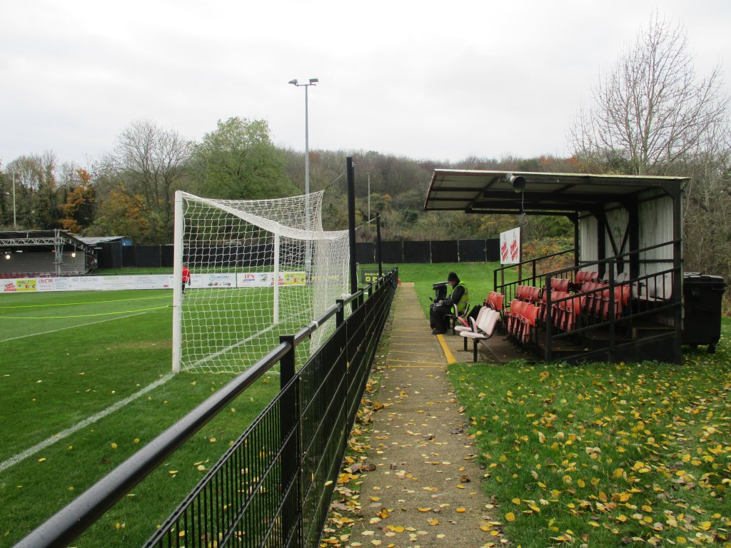 The turnstiles and clubhouse/dressing rooms are in a corner of the ground, straight in front of you as you go in off the road. I went in through the bar and down some steps and showed my ticket to a steward there. On one side of the ground, there is some uncovered terracing with a covered seated stand (all seats are unreserved) further along. With some scaffolding poles holding up the roof along the front as well as people walking past, there can by an obscured view of the pitch. The end to the right of this side (entrance end) is uncovered flat standing whilst at the other end, there is a small covered seated stand behind the goal with the rest of the end being uncovered flat standing. The opposite side has some covered terracing in the middle with the dugouts either side of this though this side was not open to the public as it was part of the red zone. The camera position is on the roof above the terracing. There are toilets near the turnstiles and in the bar. This is a ground/clubs that are very welcoming for you to take dogs (as long as kept on leads) along with some bowls of water and biscuits left for them near the entrance.