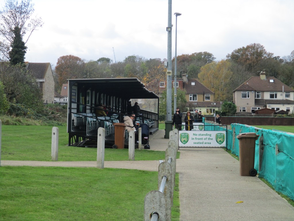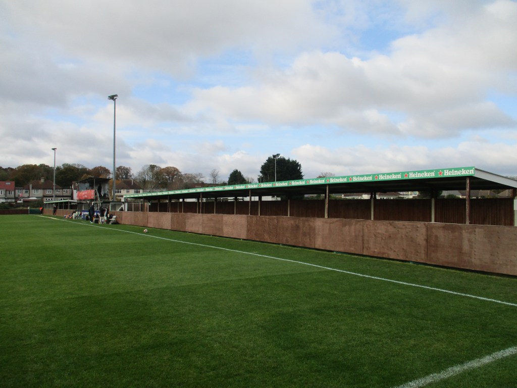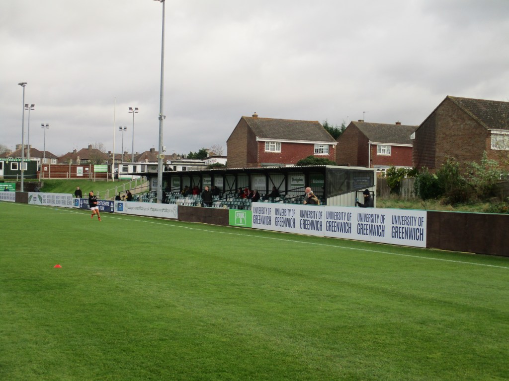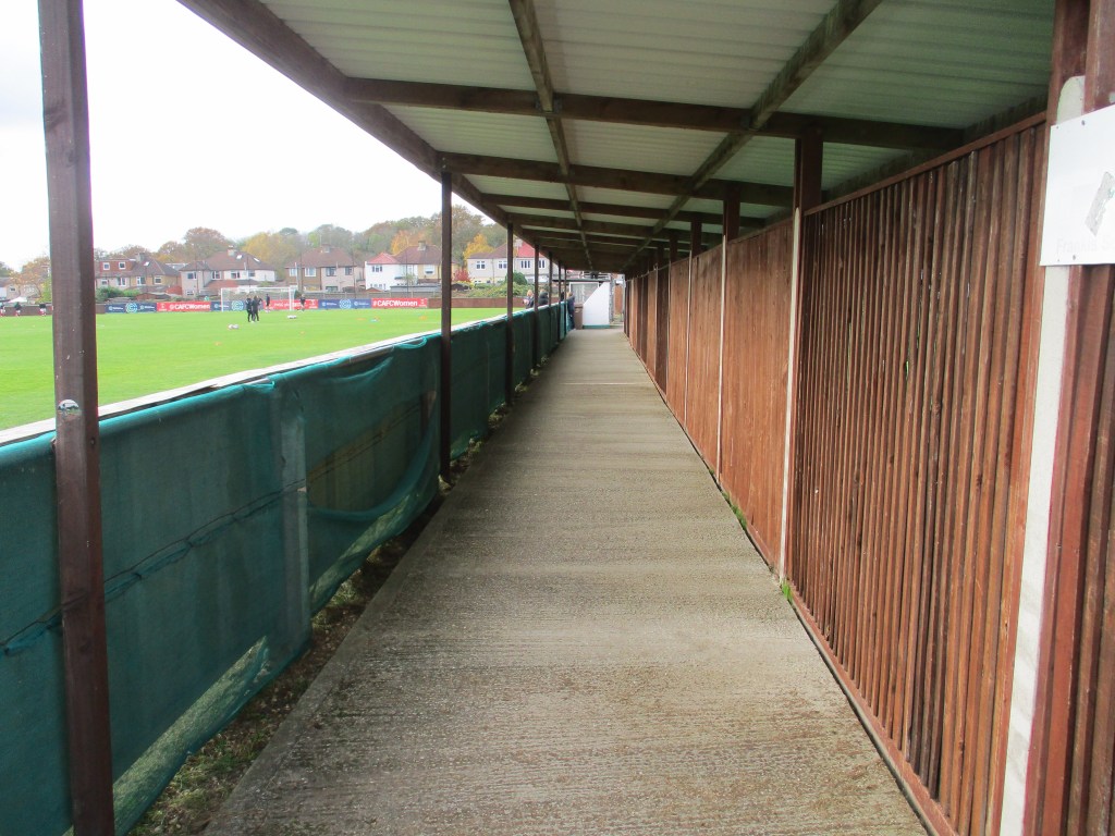 The turnstiles, which opened about an hour before kick off, are in one corner of the ground with a slight slope leading down to pitch side. There is a covered seated stand, which has a few rows of green and white seats (all unreserved), covering about a third of the pitch on one side of the ground with the slope and uncovered flat standing on either side of this. The opposite side has covered flat standing on either side of the dugouts and camera position. Both ends are uncovered flat standing. The dressing rooms are set back slightly from the ground, diagonally across the pitch from the turnstiles. There was a bag search before going into the ground. There are toilets inside the ground next to the turnstiles as well as inside the clubhouse. The ground is a bit exposed and was very cold when I went with the wind blowing from the north across it.