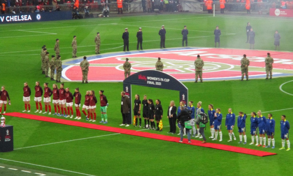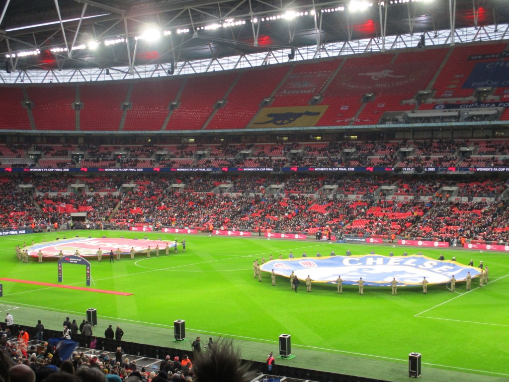 The rain stopped shortly after, and I went up to the turnstiles on the upper level. There was still about half an hour until they opened so I took a photo of the Bobby Moore statue outside the front of the stadium then joined a queue at the turnstiles my ticket was for. At 12:30 the turnstiles opened and I went in, scanning my ticket then going through an airport style metal detector. I didn’t have a bag with me so the security guy waved me through into the vast concourse area where there are lots of food kiosks and toilets. After that I went into the stadium to find my seat. My seat was near the top of the bottom tier, near one of the corners (at the Chelsea end) on the tunnel side and across a barrier from the press area (which meant a wave before and a quick chat after the match with Charlotte who was there for On Her Side!). There was an army band playing to start with then Ella Henderson sang a few songs. When the teams came out to do their warm ups, I went back to the concourse area to get some food and a drink (had a steak pie and with a drink cost £8.80). After that it was back to my seat and almost time for the action on the pitch to begin!