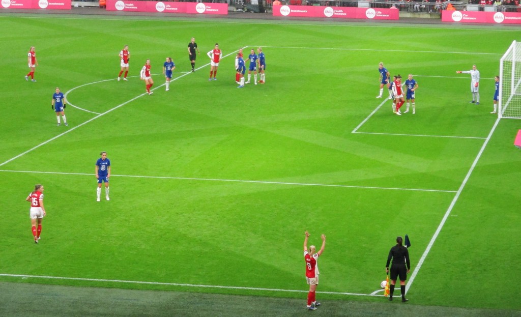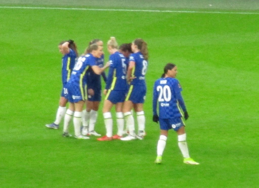 Pyrotechnics went off as the players came out before they were introduced to the guests of honour, the national anthem was sung by Ella Henderson and the players took a knee before kick off. It didn’t take long for Chelsea to take the lead when Fran Kirby scored after 3 minutes. Chelsea had chances to increase their lead in the first half but were denied by a combination of hitting the woodwork a few times and some good saves by Zinsberger in goal for Arsenal. I was starting to think if it would be one of those afternoons where Chelsea would be ruing those missed opportunities in the first half as they went in at half time only leading 1-0.