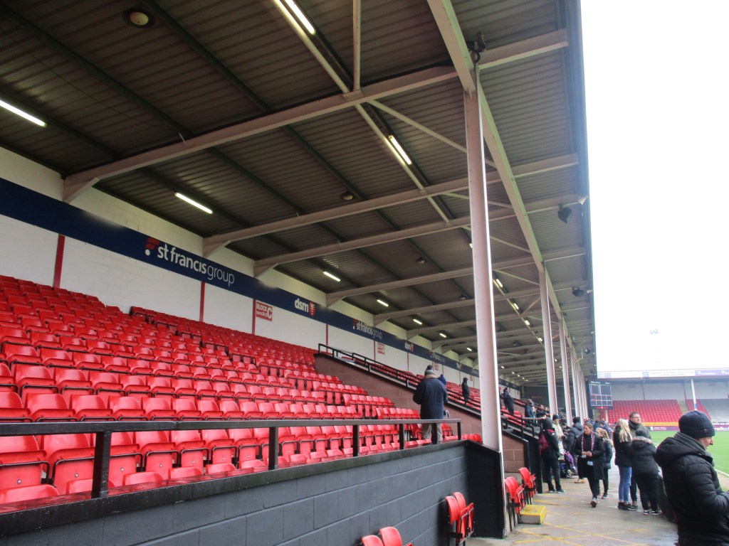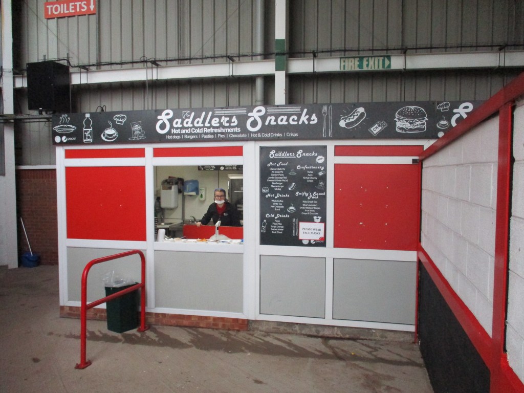There are food kiosks at either end of the stand in the corners of the ground. They accepted card payment only. There were long, slow moving queues at half time even with under 500 people in attendance at the match I was at. There is a McDonalds in the retail park next to the ground as well as a Park Inn by Radisson hotel but not much else that close by.