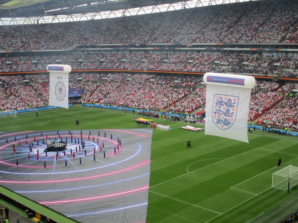 I was sat in the top tier but thankfully there were escalators up to it. The view though was amazing from up in the gods though (I wasn’t that far back, three rows from the front of the tier)! I went back into the concourse area for some food and a few nerve calming drinks! The teams were announced and Sarina Wiegman had picked the same starting 11 for England for the sixth game in a row at the Euro’s! I missed the pre-match show from Becky Hill, and got back to me seat just before the sides came out. It was another WOW moment walking back into the stadium and seeing Wembley full for the final! The national anthems were sung, Tiny Buzz brought the ball on and then it was time for the match to get underway!