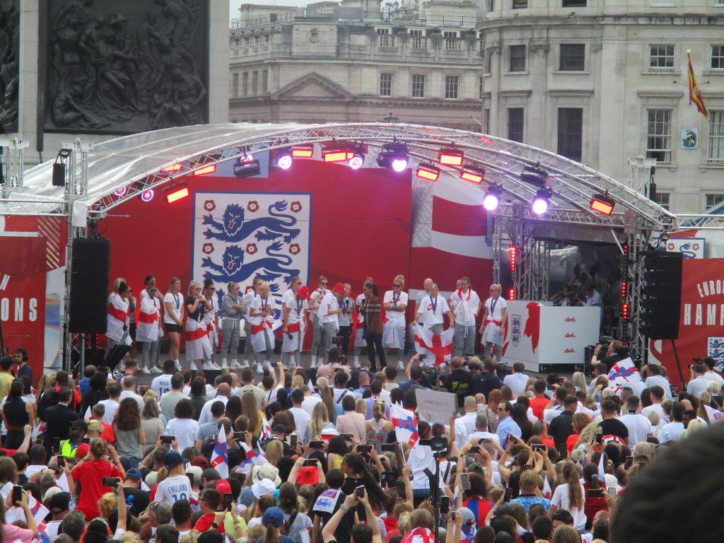 A victory celebration in Trafalgar Square in London had been announced after the win for Monday lunchtime. I got there just before 11am and it was already busy and I got a free flag as I went in. I stood near the back of the square, a bit higher up to get a good view. Three Lions was played a number of times before the squad came on and it was amazing to see all the flags being waved.